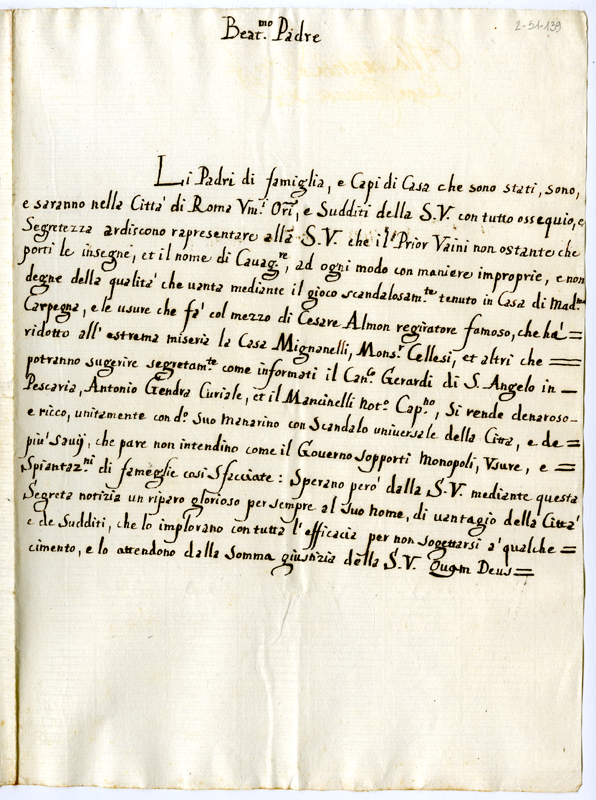 Lettera dei padri di famiglia e capi di casa di Roma a papa Clemente XI (1700-1721)