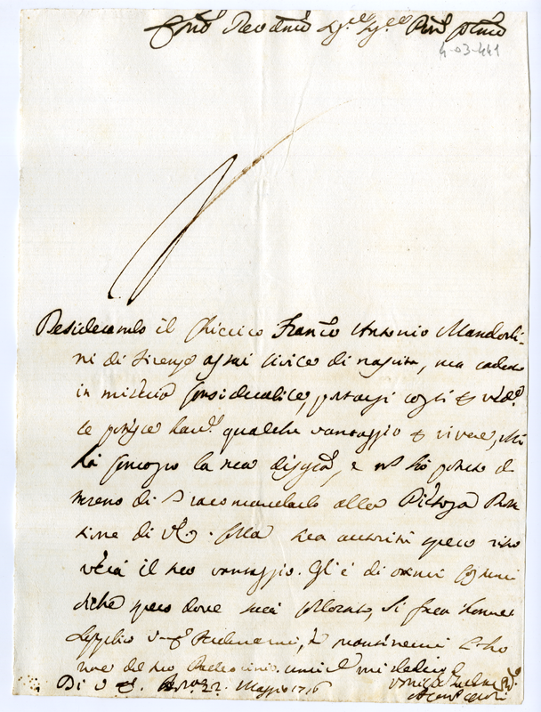 Chiede la protezione del cardianle del chierico Francesco Antonio Mandorlini
