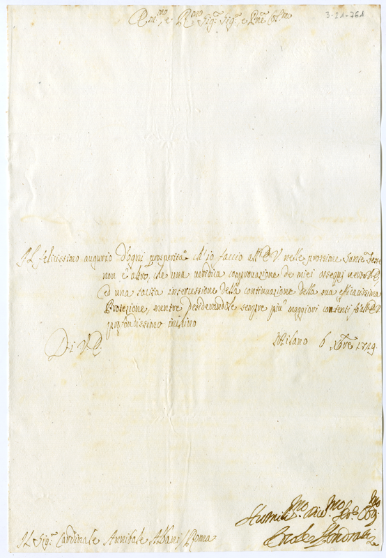 Lettera di Ercole Sfondrati al cardinale Annibale Albani (1729 dicembre 6)