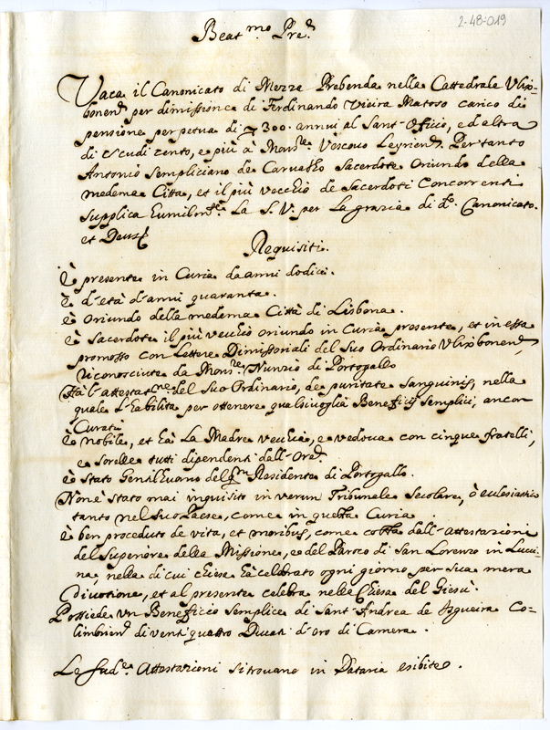 Chiede un canonicato vacante nella cattedrale di Lisbona e un beneficio di scudi 100 per morte del vescovo di Leiria. Allega i rquisiti