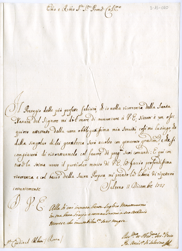 Lettera di Pablo arcivescovo di Salerno al cardinale Annibale Albani (1727 dicembre 11)