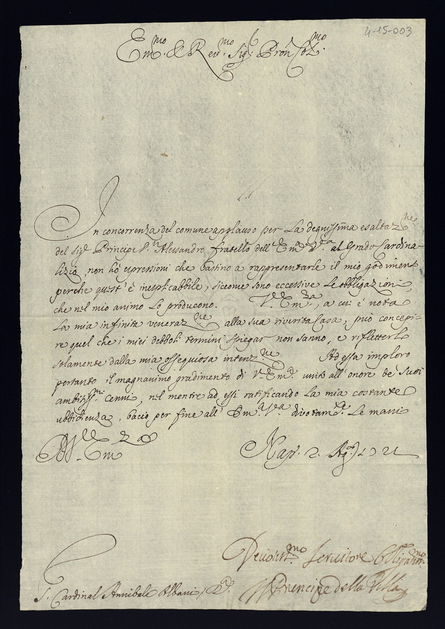 Lettere di congratulazione per l'esaltazione alla Porpora dell'eminentissimo cardinale Alessandro Albani