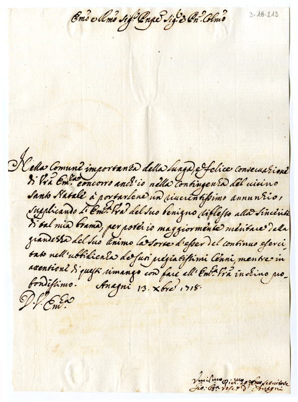 Lettera di Giovanni Battista vescovo di Anagni ad Annibale Albani (1718 dicembre 13)