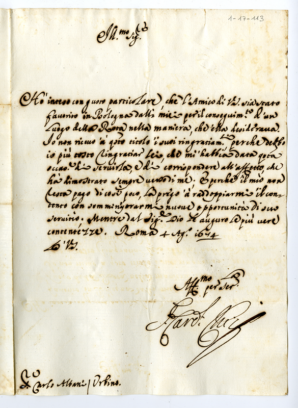 Lettera del cardinale Flavio Chigi senior a Carlo Albani (1674 agosto 4)