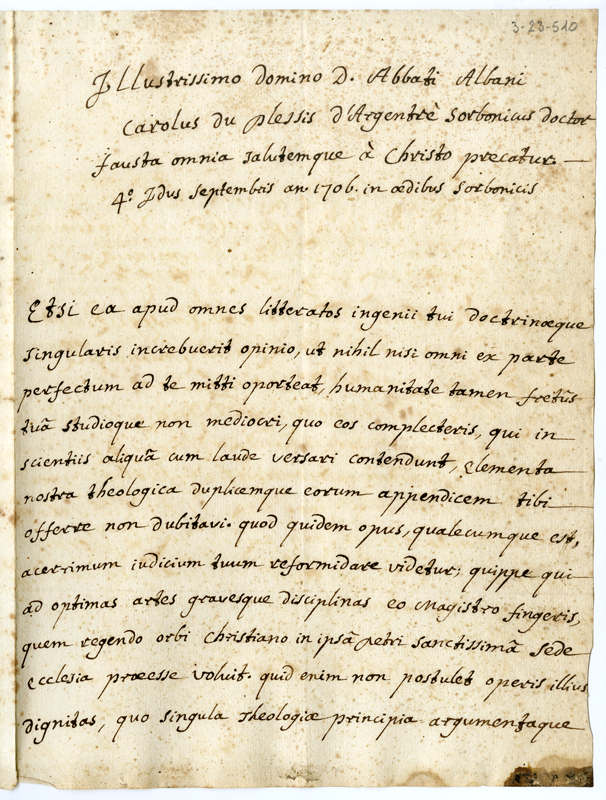 Lettera di Carlo du Plessis d'Argentré dottore alla Sorbona all'abbate Annibale Albani (1706 settembre 10)