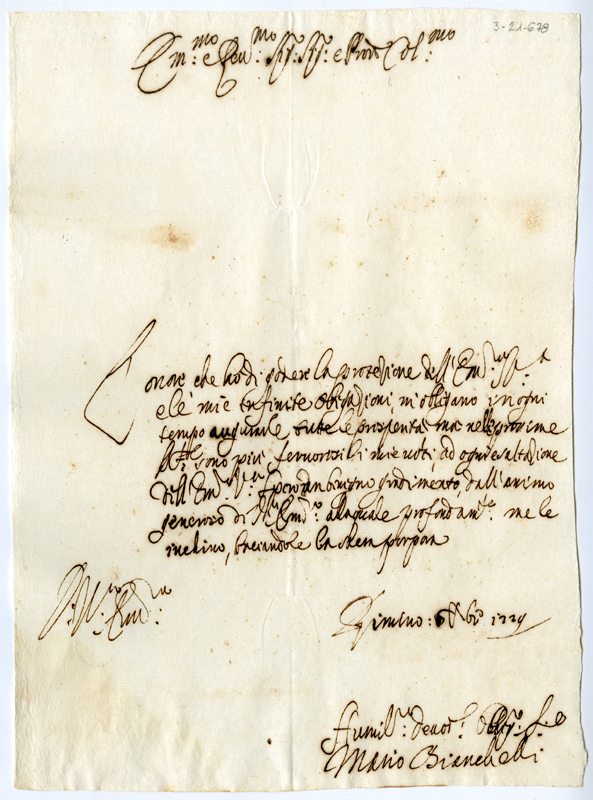 Lettera di Mario Branchelli al cardinale Annibale Albani (1729 dicembre 6)