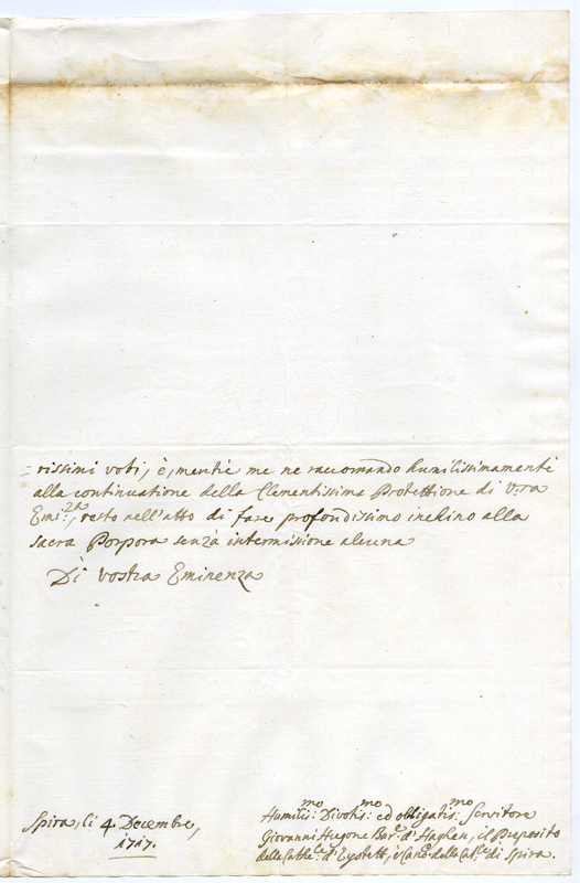 Lettera di Giovanni Hugone barone di Haghen al cardinale Annibale Albani (1717 dicembre 4)