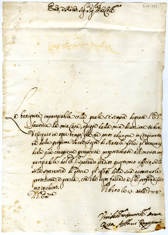 Lettera di Rosa Albani Rangoni al cardinale Annibale Albani (1718 dicembre 12)