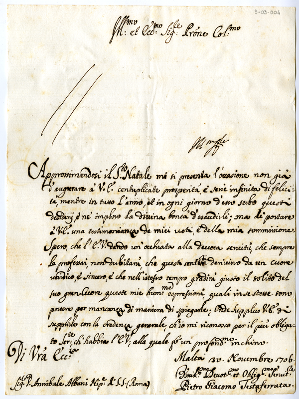 Lettera di Pietro Giacomo Testaferrata ad Annibale Albani (1706 novembre 30)