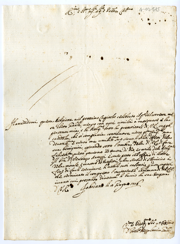 Lettera di Girolamo Mezzalancia al Cardinale Annibale Albani (1716 giugno 4)