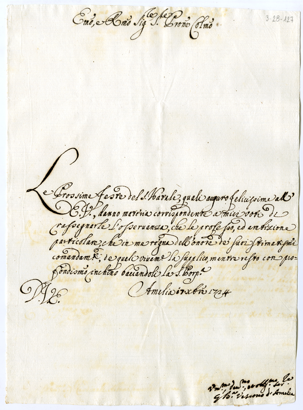 Lettera di Giovanni Battista vescovo di Amelia al cardinale Annibale Albani (1724 dicembre 17)