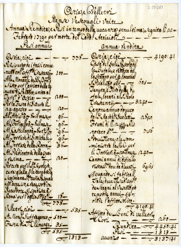 Ostia e Velletri mense vescovali unite annua rendita, e pesi in tempo della vacanza penultima, seguita li 22 febbraro 1719 per morte del Cardinale Acciaioli
