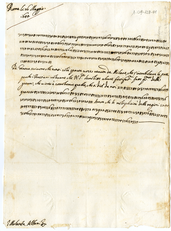 | bo.livello.titolo2 | Archivio Albani|"Lettere, e scritture, dalle quali appariscono Li Servigij fedelmente resi alla Sede Apostolica da Malatesta Albani sotto il Pontificato d'Urbano Ottavo, tanto in tempo di Guerra, quanto in tempo di pace alla Sua morte seguita in Francia Li 7 Ottobre 1645. Distintamente indicate ne seguenti fogli"|"Lettere del Cardinale Francesco Barberini scritte da Roma nelli mesi di Maggio, Giugno,Luglio, ed Agosto 1644 in piano, e in cifra à Malatesta Albani in Parigi con la discifrazione delle seconde di mano dell'istesso Malatesta Albani dalle quali appariscono le gravi commissioni date al medesimo da eseguirsi nella Corte di Francia per servizio della Sede Apostolica"|"Lettere in piano e in cifra del Signor Cardinale Francesco Barberini, scritte da Roma à Malatesta Albani in Parigi nel mese di maggio 1644, con la discifrazione delle seconde di mano dell'istesso Malatesta Albani (1644 maggio)"|Documenti contenuti | |