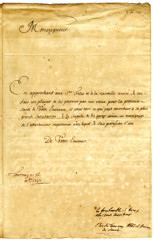 Lettera del vescovo di Tournai al cardinale Annibale Albani (1727 dicembre 3)