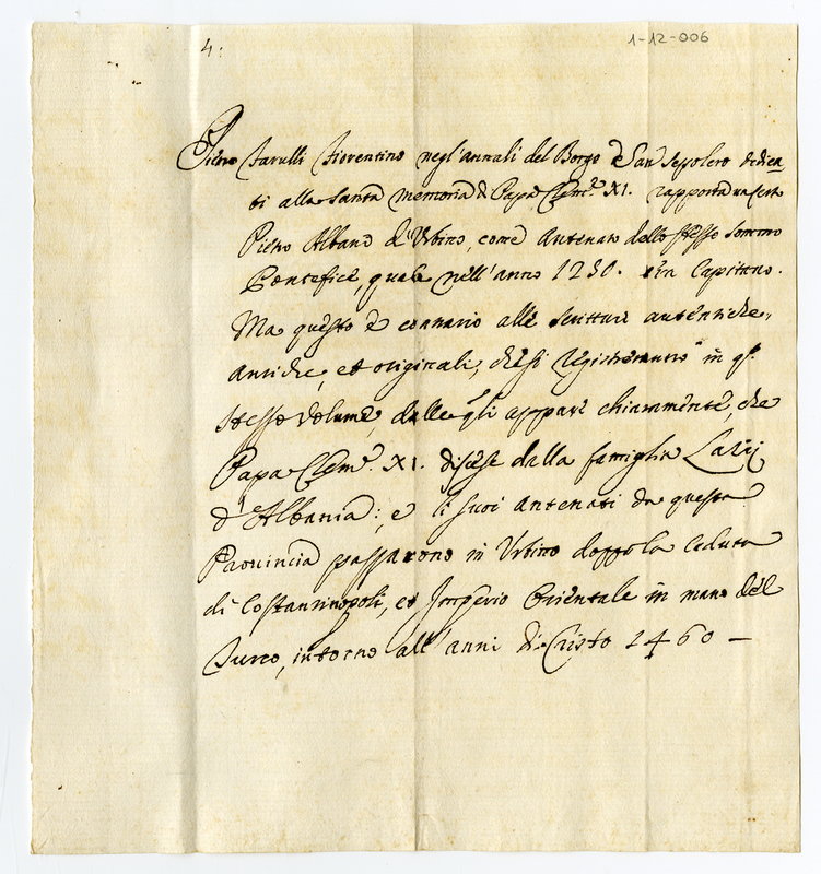 Indicazione di rapporto di parentela tra Pietro Albani di Urbino con la famiglia del papa Clemente XI e dichiarazione di discendenza dello stesso papa dalla famiglia Lazij di Albania, venuti ad Urbino dopo la caduta di Costantinopoli