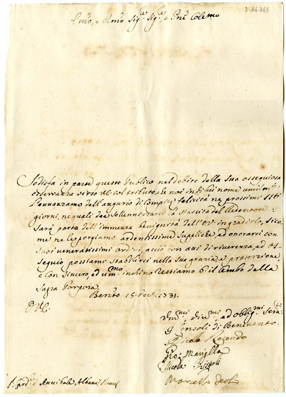 Lettera dei consoli di Benevento al cardinale Annibale Albani (1731 dicembre 15)