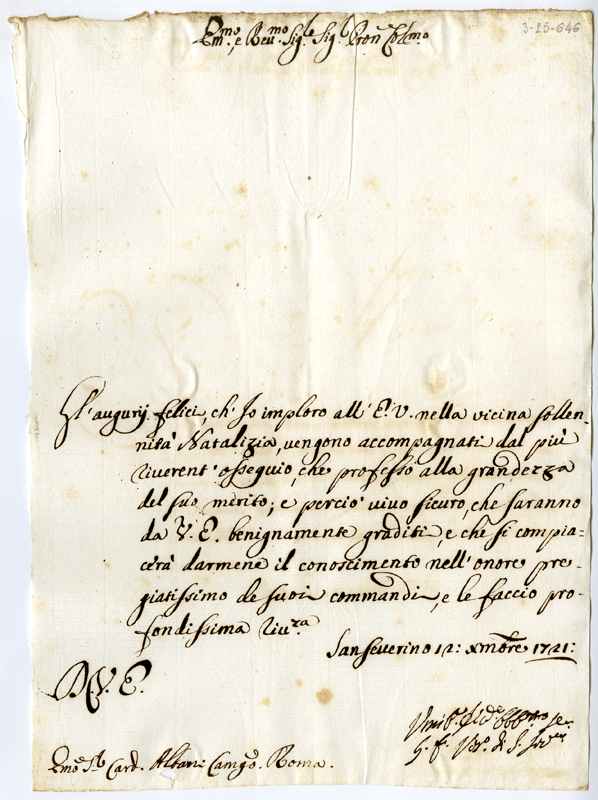 Lettera di Giovan Francesco vescovo di Sanseverino al cardinale Annibale Albani (1721 dicembre 12)