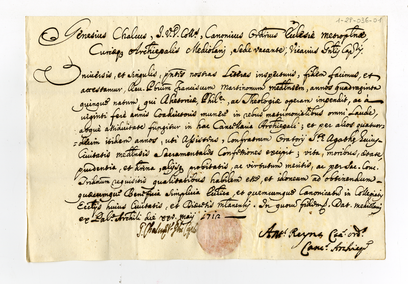 Attestazione di buone qualità del sacerdote Francesco Martinoni (1712 maggio)