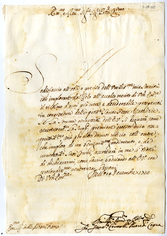 Lettera di fra Ferdinando Crinelli priore di Capua al cardinale Annibale Albani (1712 dicembre 14)