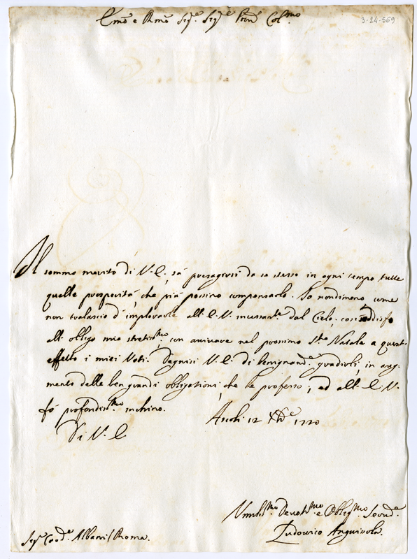 Lettera di Ludovico Anguissola al cardinale Annibale Albani (1720 dicembre 12)