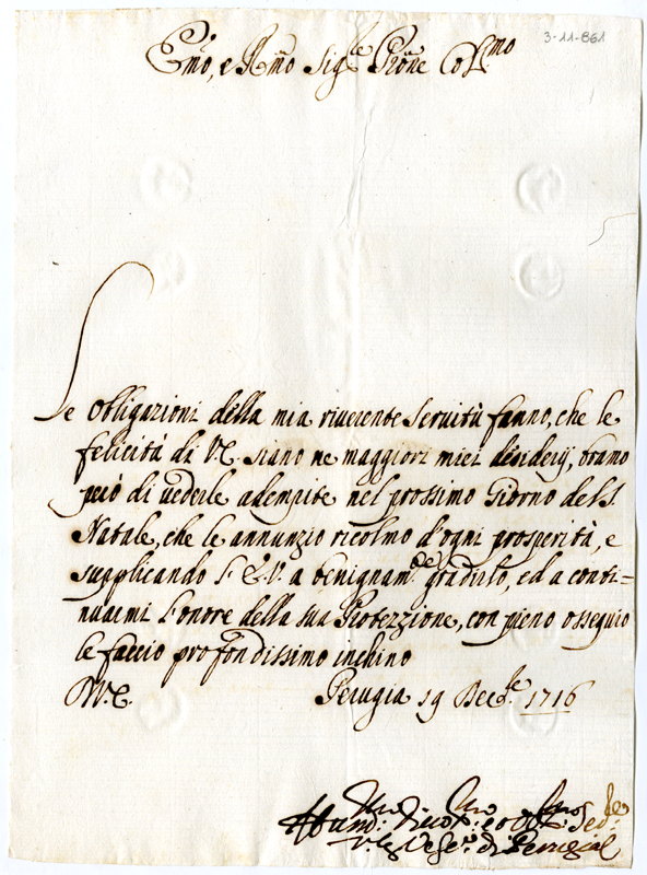Lettera di Vitale arcivescovo di Perugia al cardinale Annibale Albani (1716 dicembre 19)