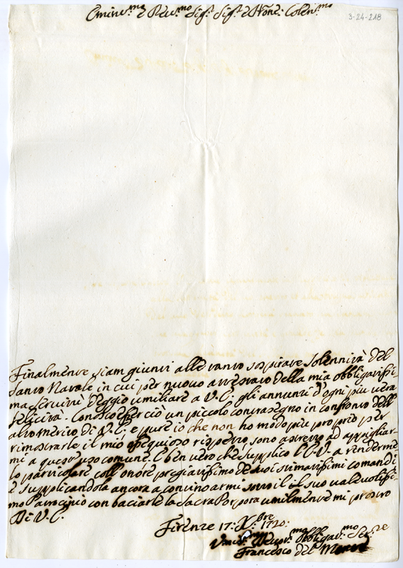 Lettera di Francesco del Monte al cardinale Annibale Albani (1720 dicembre 17)