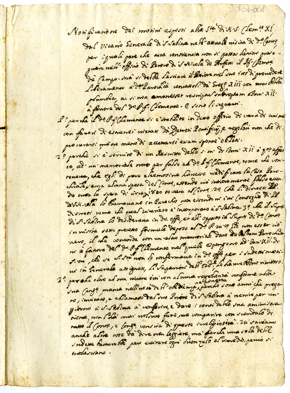 Notificazione dei motivi esposti alla Santità di Nostro Signore Clemente XI dal Vicario Generale di Santa Sabina (1700-1721)