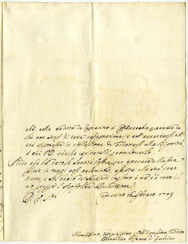 Lettera di Bernardino vescovo di Camerino a papa Clemenete XI (1709 febbraio 16)