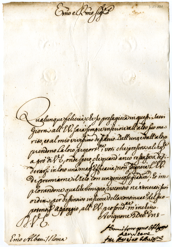 Lettera dell'arcivescovo di Avignone al cardinale Annibale Albani (1718 dicembre 7)