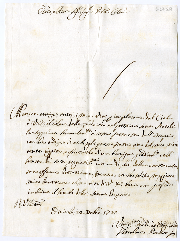 Lettera di Diotaleno Pinzoni al cardinale Annibale Albani (1723 dicembre 22)