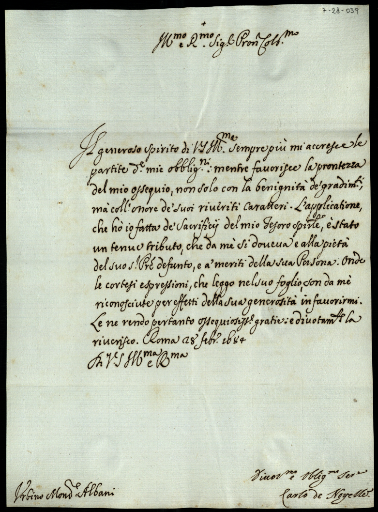 Lettere di personaggi scritte a Monsignor Albani in condoglianza della morte del Signor Carlo suo padre