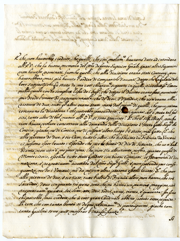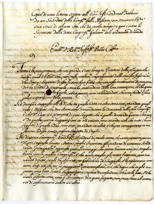 Copia di una lettera scritta all'Eminentissimo Cardinale Fabroni da un Sacerdote della Congregazione della Missione per sincerare l'Eminenza sua circa di alcune cose, che da molto tempo in qua contro li Superiori della detta Congregazione falsamente se le andavano dicendo (1711 gennaio 12)
