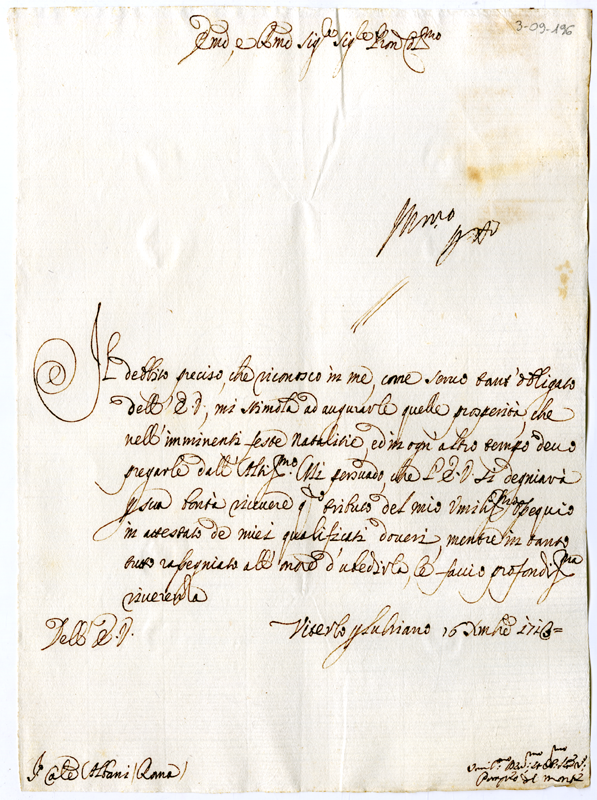 Lettera di Pompeo del Monte al cardinale Annibale Albani (1713 dicembre 16)