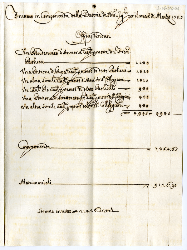 Fruttato in Componenda della Dateria di Nostro Signore per il mese di Marzo 1720