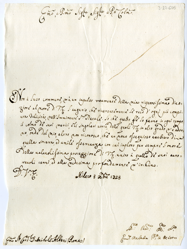 Lettera di Ercole Michele vescovo di Mileto al cardinale Annibale Albani (1723 dicembre 3)