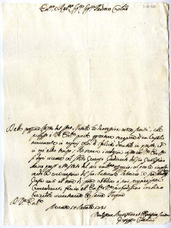 Lettera di Giuseppe Ciccolini al cardinale Annibale Albani (1731 dicembre 14)