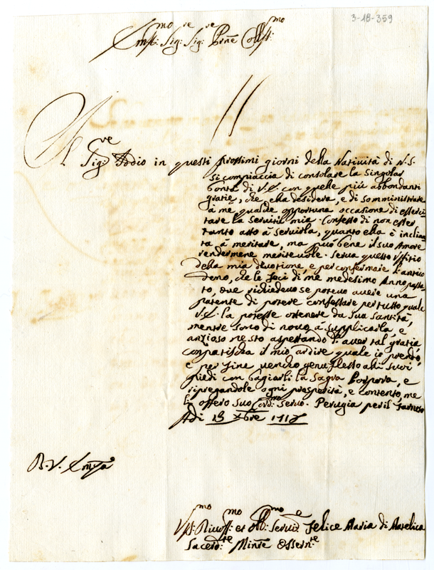Lettera di Felice Maria di Matelica sacerdote minore osservante ad Annibale Albani (1718 dicembre 13)