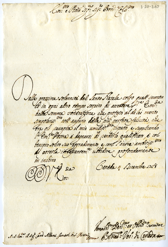 Lettera di Benedetto vescovo di Ceneda al cardinale Annibale Albani (1728 dicembre 4)