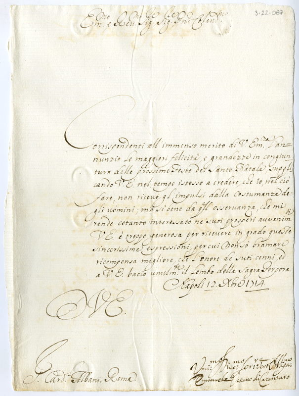 Lettera di Emanuele vescovo di Catanzaro al cardinale Annibale Albani (1714 dicembre 12)