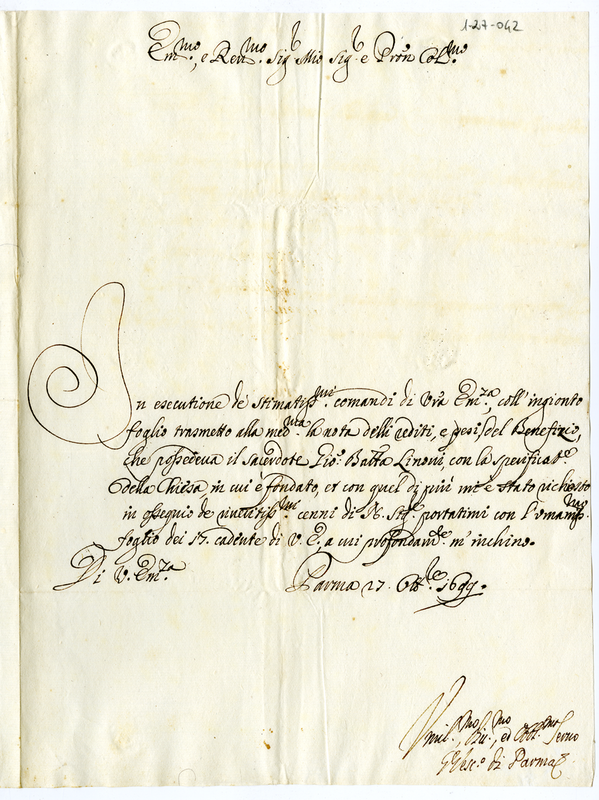 Lettera del Vescovo di Parma ad un Cardinale (1699 ottobre 27)