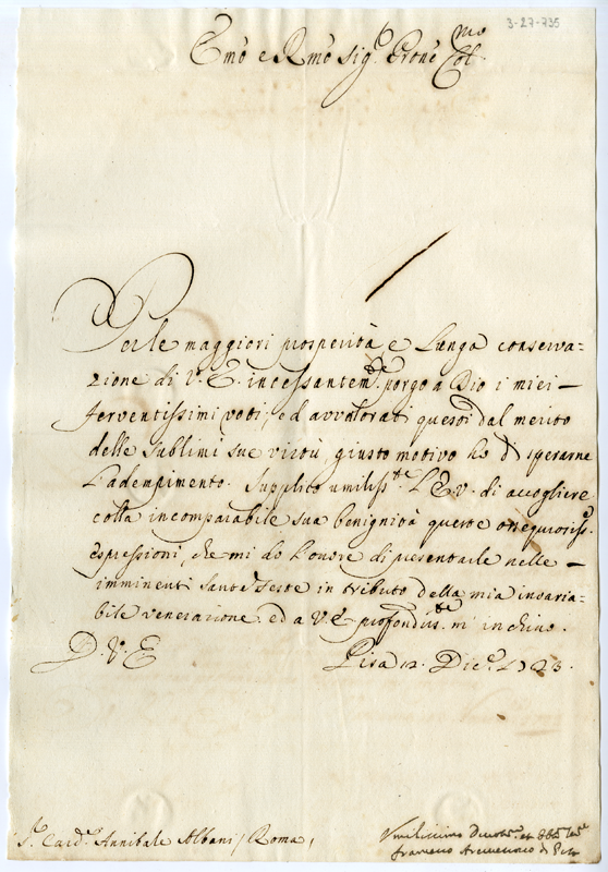 Lettera di Francesco arcivescovo di Pisa al cardinale Annibale Albani (1723 dicembre 12)