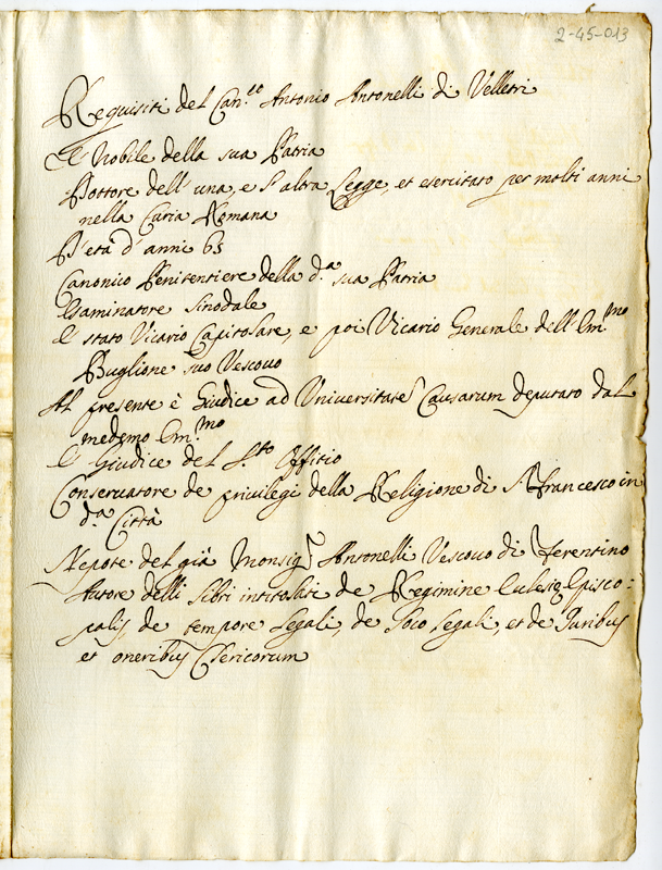 Requisiti del Canonico Antonio Antonelli di Velletri (1700-1721)