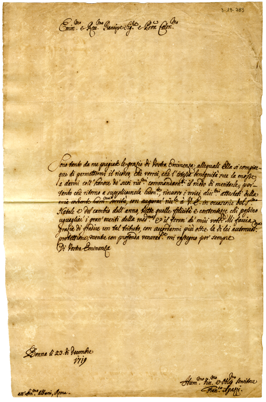 Lettera di Francesco Agazzi al cardinale Annibale Albani (1719 dicembre 23)
