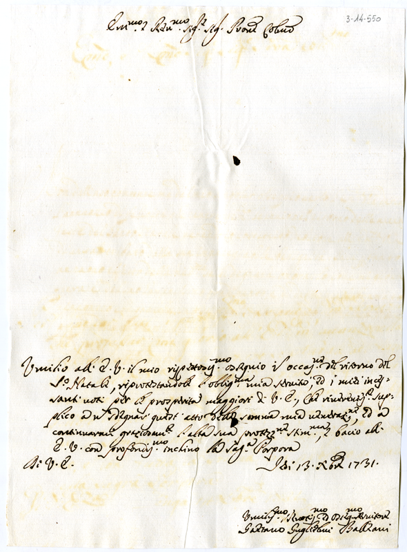 Lettera di Gaetano Guglielmi Balleani al cardinale Annibale Albani (1731 dicembre 13)