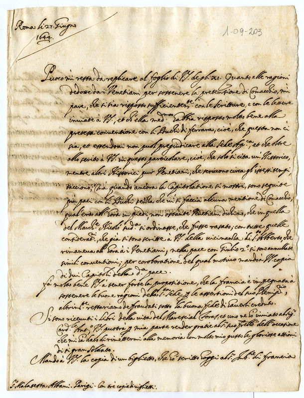 Lettera del cardinale Barberini Francesco a Malatesta Albani (1644 giugno 27)