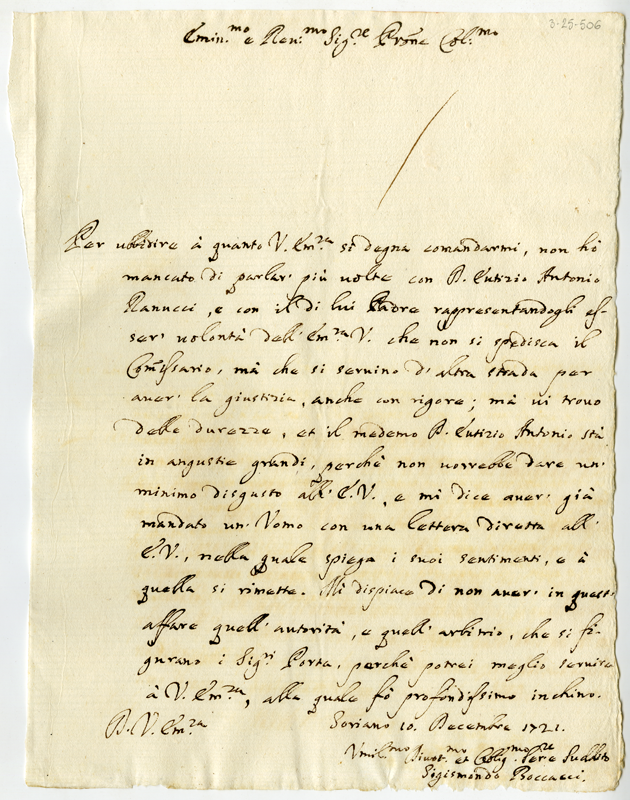 Lettera di Sigismondo Boccacci al cardinale Annibale Albani (1721 dicembre 10)