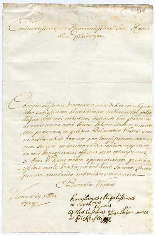 Lettera di Vito Eusebio conte di Falkenstein al cardinale Annibale Albani (1729 dicembre 17)