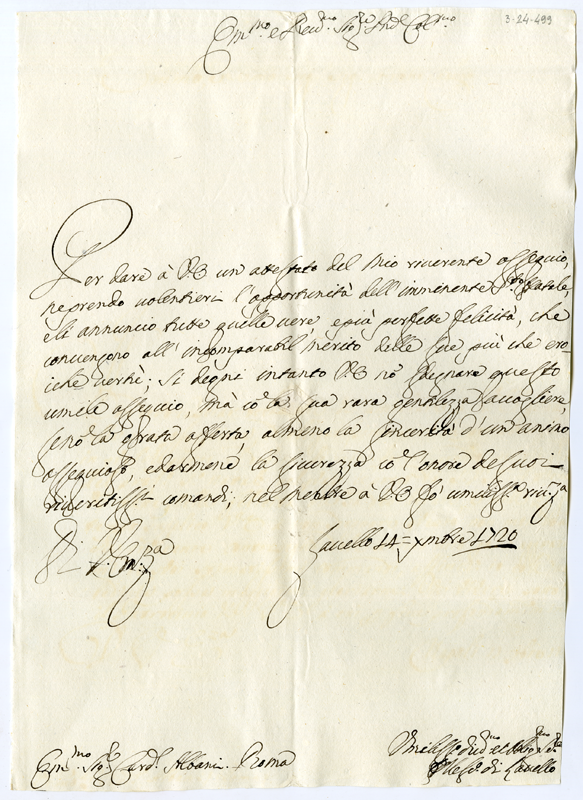 Lettera di Nicolò vescovo di Lavello al cardinale Annibale Albani (1720 dicembre 14)