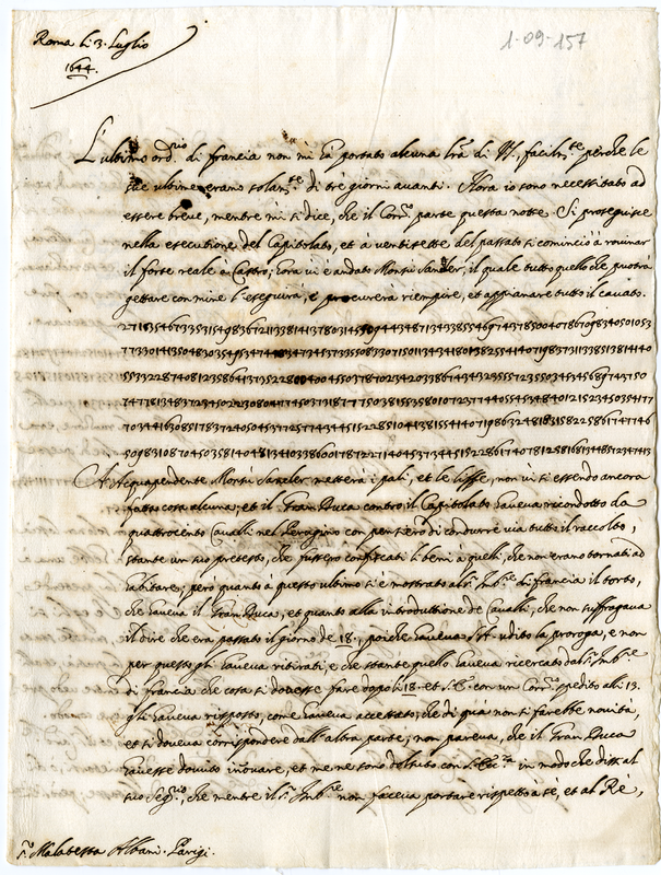 Lettera del cardinale Barberini Francesco senior a Malatesta Albani (1644 luglio 3)
