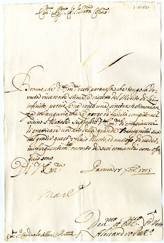 Lettera di Alessandro Pallavicino al cardinale Annibale Albani (1715 dicembre 17)